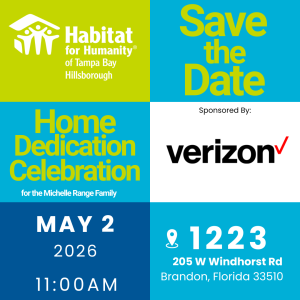 Save the date for the Habitat for Humanity of Tampa Bay Hillsborough Home Dedication for the Michelle Range Family, sponsored by Verizon. Don’t miss out on this touching moment!