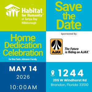 Save the date for the Habitat for Humanity of Tampa Bay Hillsborough Home Dedication for the Paris Johnson Family, sponsored by AJAX Paving. Don’t miss out on this touching moment!